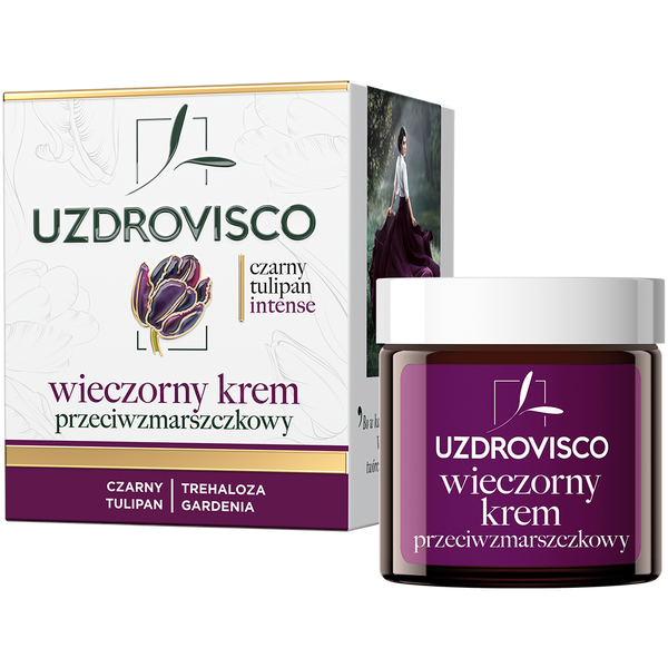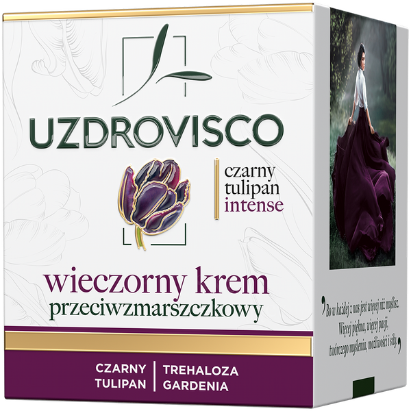 Crema Intensa de Noche Antiedad con Tulipán Negro. ¡La fórmula Intense ofrece una acción aún más potente gracias al innovador extracto de gardenia!