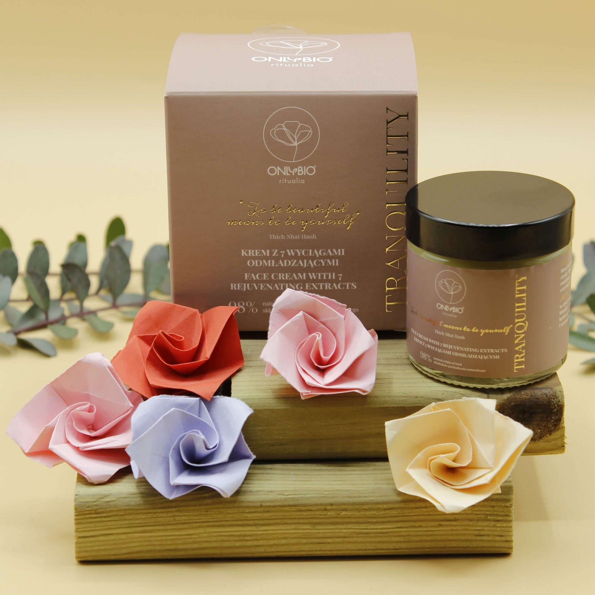 La crema rejuvenecedora Ritualia de OnlyBio con 7 extractos es una fórmula moderna y rica con propiedades anti-envejecimiento. Los extractos de jazmín, granada, pomelo, aloe, caléndula, centella asiática y jengibre son potentes antioxidantes. Favorecen los procesos de renovación, estimulan la producción de colágeno y combaten los radicales libres, gracias a lo cual la piel está tersa, vital y radiante.