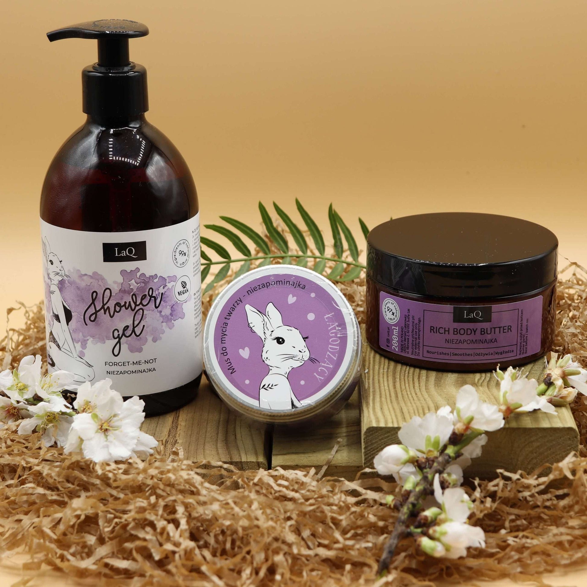 Pack para el cuidado facial y corporal femenino con la fragancia “Nomeolvides” de LaQ, compuesto por un gel de ducha, una mousse facial y una crema densa corporal (Body Butter).