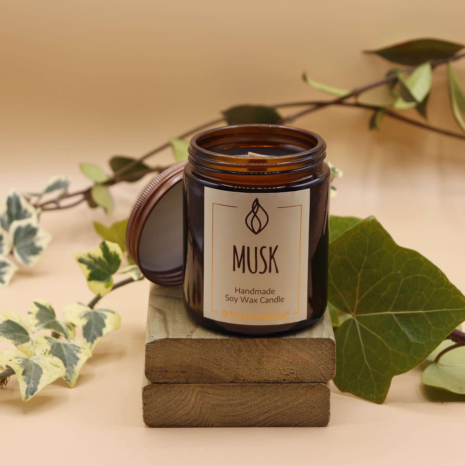 Vela de soja 100% natural en elegante vaso de vidrio oscuro ecológico con mecha de madera, con perfume de almizcle.